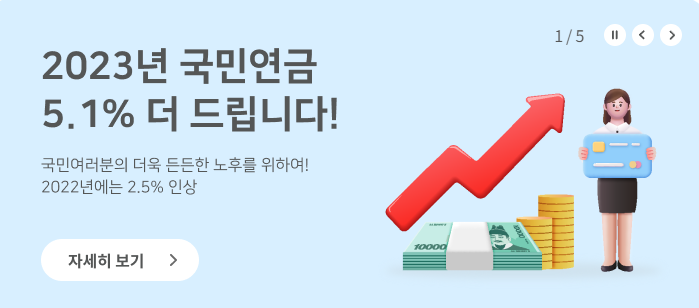 2023년 국민연금 연금액 5.1% 인상 지급 안내가 되었습니다. 현재 국민연금을 받고있는 약 633만 명의 연금액이 2022년도 전국소비자물가변동률을 반영하여 5.1% 인상됩니다.