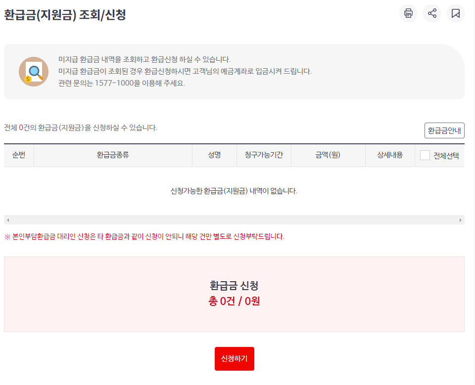 3. 환급금 조회후 신청가능한 환급금이 있는 경우 신청하기 클릭