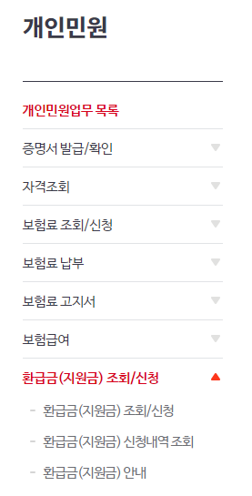 2. 로그인 후 개인민원 > 환급금 (지원금) 조회/신청 카테고리 선택