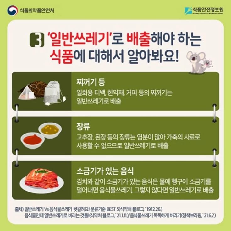 일회용 티백, 한약재, 커피등의 찌꺼기는 일반쓰레기로 배출하고 고추장 된장등의 장류는 염분이 많아 사료로 사용할 수 없어 일반쓰레기로 배출합니다. 김치와 같이 소금기가 있는 음식은 물에 헹구어 소금기를 덜어내면 음식물쓰레기 그렇지 않다면 일반쓰레기로 배출합니다.