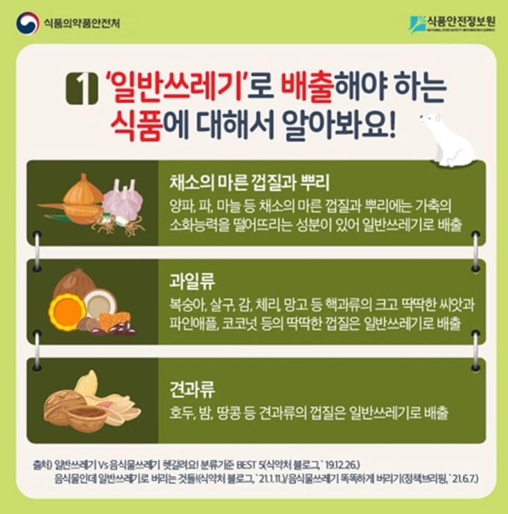 하지만 양파 , 파 , 마늘 등 채소의 마른 껍질과 뿌리에는 가축의 소화능력을 떨어뜨리는 성분이 있어 일반쓰레기로 배출 합니다. 과일도 딱딱한 씨앗과 파인애플, 코코넛 등 딱딱한 껍질은 일반쓰레기로 배출합니다. 그 외에도 견과류의 껍질도 딱딱하기 때문에 일반쓰레기로 배출합니다.