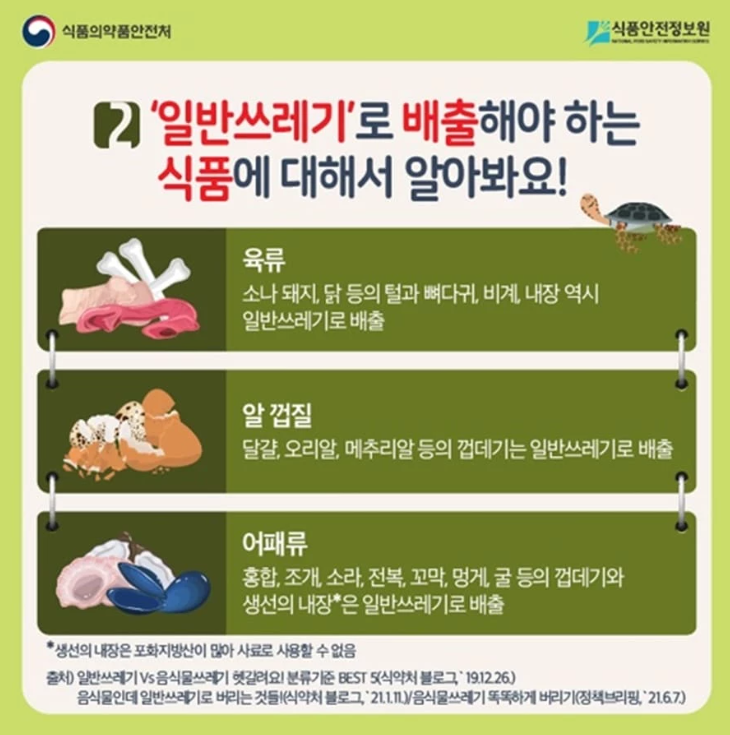 육류의 털과 뼈다귀, 비계, 내장 역시 일반쓰레기로 배출하고, 달걀 오리알 메추리알 등의 껍데기 그리고 어패류의 껍데기 생선의 내장은 일반쓰레기로 배출합니다. 생선의 내장은 포화지방산이 많아 사료로 사용할 수 없습니다.
