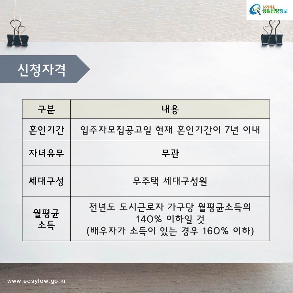 √ 전년도 도시근로자 가구당 월평균 소득의 140%(배우자가 소득이 있는 경우에는 160%) 이하일 것