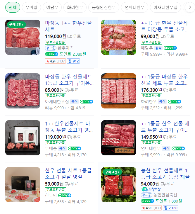 네이버에 검색만 해보아도 다양한 가격대에 한우선물 세트들이 준비되어있습니다. 평균 10만원 내외로 준비하면 되니, 예산에 맞게 준비하는 것도 좋습니다!